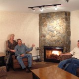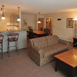 In the living room is a 52” HDTV flat screen. The living room features a double pull-out couch, armchair, second couch, wood-burning fireplace and large balcony with great mountain views.